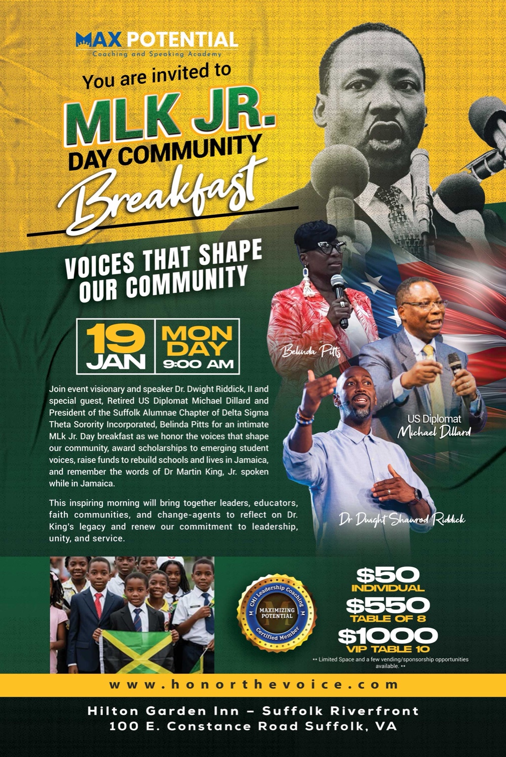 Presented by Dr. Dwight Riddick & Max Potential Coaching, and hosted by Retired United States Diplomat Michael Dillard, this inspiring morning will bring together leaders, educators, faith communities, and change-agents to reflect on Dr. King’s legacy and renew our commitment to leadership, unity, and service.
